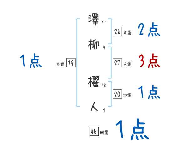 天運![]() | 澤柳櫂人さんの天運は26画の2つ星!波瀾万丈かも。信頼できる人を大事にしましょう。 家系が持つ宿命的な運勢を表します。祖先から受け継いだ苗字ですので自分の力が及びません。家柄を象徴します。 |