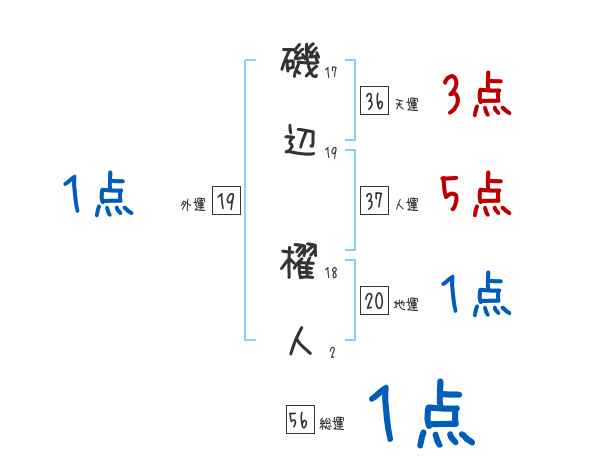人運![]() | 磯辺櫂人さんの人運は37画の5つ星!努力家で順応性に優れる。現実的な考え方ができ忠実に物事をこなす。 性格や才能などを表す2番目に重要な運勢です。人間関係や協調性、社会的な成功に影響します。主に20歳から50歳ぐらいまでの中年期の運勢を表します。 |