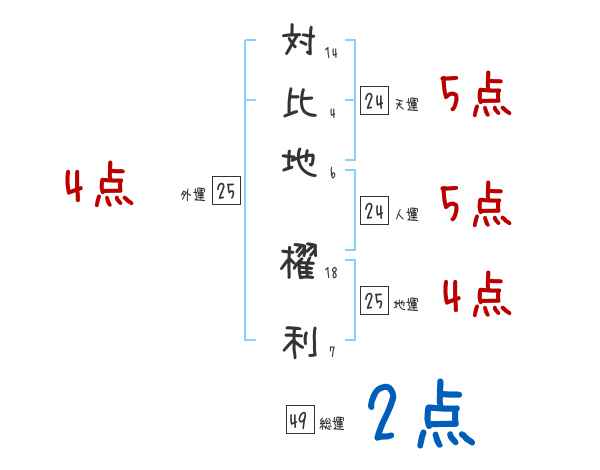 地運![]() | 対比地櫂利さんの地運は25画の4つ星!個性があり才能があふれる。強運の持ち主で発展する。 個性を表す基礎的な運勢です。性格形成や対人関係、行動力など家庭環境に影響されます。主に誕生してから20歳くらいまでの若年期の運勢を表します。 |