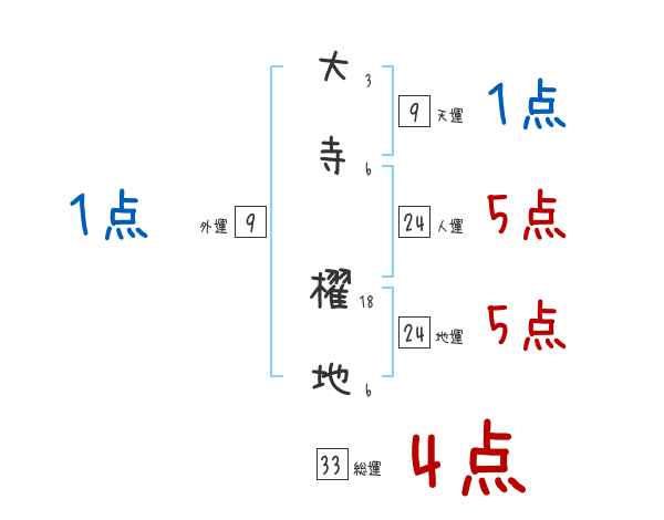 天運![]() | 大寺櫂地さんの天運は9画の1つ星!消極的で才能を発揮することが苦手なことも。周りの意見に耳を傾けましょう。 家系が持つ宿命的な運勢を表します。祖先から受け継いだ苗字ですので自分の力が及びません。家柄を象徴します。 |