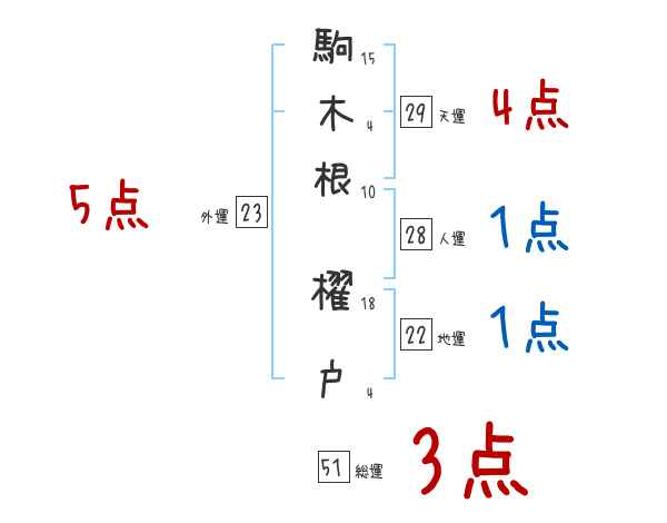 天運![]() | 駒木根櫂戸さんの天運は29画の4つ星!完全主義で才能がある。厳格な心の持ち主。 家系が持つ宿命的な運勢を表します。祖先から受け継いだ苗字ですので自分の力が及びません。家柄を象徴します。 |