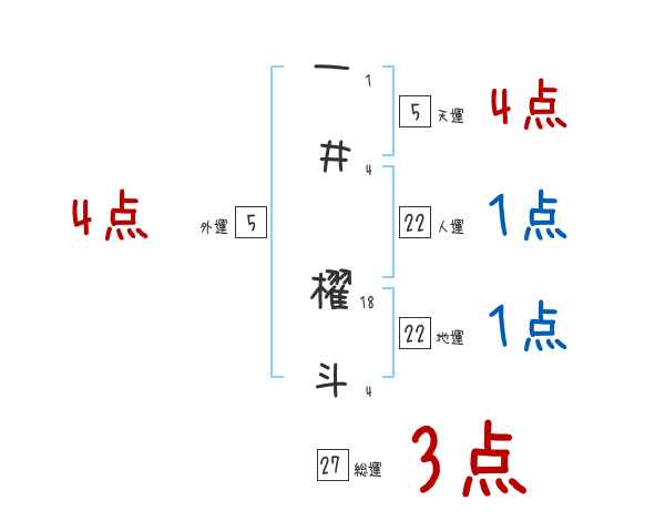 外運![]() | 一井櫂斗さんの外運は5画の4つ星!健康で安泰。協調性に優れ、財産に恵まれる。 生活面を象徴する運勢です。外部から受ける影響力を表し、結婚運、家庭運や職場、環境への順応性を表します。 |