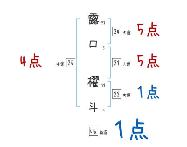 人運![]() | 露口櫂斗さんの人運は21画の5つ星!統率力がある。独立し成功する。名誉を手に入れる。 性格や才能などを表す2番目に重要な運勢です。人間関係や協調性、社会的な成功に影響します。主に20歳から50歳ぐらいまでの中年期の運勢を表します。 |