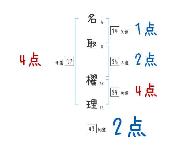 外運![]() | 名取櫂理さんの外運は17画の4つ星!積極的な行動力。地位を気づき財産を手に入れる。純粋な心と直感力。 生活面を象徴する運勢です。外部から受ける影響力を表し、結婚運、家庭運や職場、環境への順応性を表します。 |