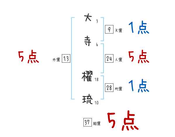 天運![]() | 大寺櫂琉さんの天運は9画の1つ星!消極的で才能を発揮することが苦手なことも。周りの意見に耳を傾けましょう。 家系が持つ宿命的な運勢を表します。祖先から受け継いだ苗字ですので自分の力が及びません。家柄を象徴します。 |