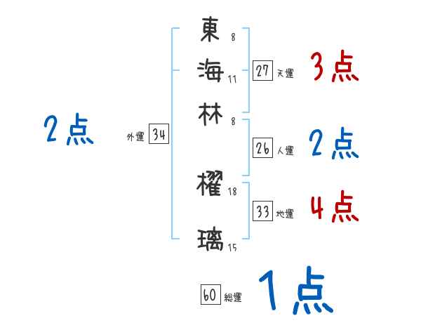 総運![]() | 東海林櫂璃さんの総運は60画の1つ星!悲観的で迷いやすい。波乱が多く損をしないように。 あなたの人生を表す1番重要な運勢です。生涯を通じて影響する総合運となり、主に50歳以降の晩年期に影響を及ぼします。 |