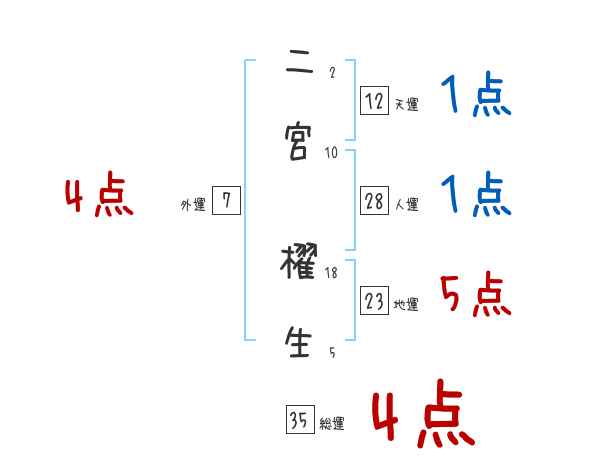外運![]() | 二宮櫂生さんの外運は7画の4つ星!強い意志や信念を持ち独立心が強い。自立する。 生活面を象徴する運勢です。外部から受ける影響力を表し、結婚運、家庭運や職場、環境への順応性を表します。 |