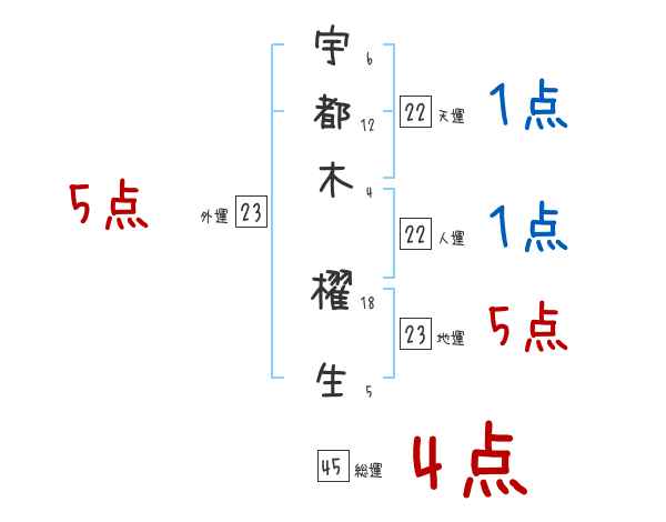 天運![]() | 宇都木櫂生さんの天運は22画の1つ星!努力することが苦手ないっぽう手先が器用。芸術性にも優れる。 家系が持つ宿命的な運勢を表します。祖先から受け継いだ苗字ですので自分の力が及びません。家柄を象徴します。 |