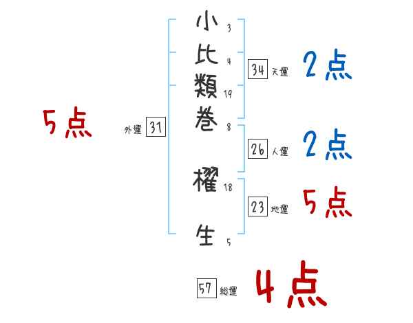 総運![]() | 小比類巻櫂生さんの総運は57画の4つ星!向上心があり人望がある。地位を得る。 あなたの人生を表す1番重要な運勢です。生涯を通じて影響する総合運となり、主に50歳以降の晩年期に影響を及ぼします。 |