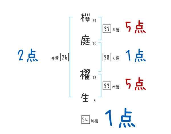 総運![]() | 桜庭櫂生さんの総運は54画の1つ星!トラブルが多いかも。周りをよく見て協調して過ごしましょう。 あなたの人生を表す1番重要な運勢です。生涯を通じて影響する総合運となり、主に50歳以降の晩年期に影響を及ぼします。 |