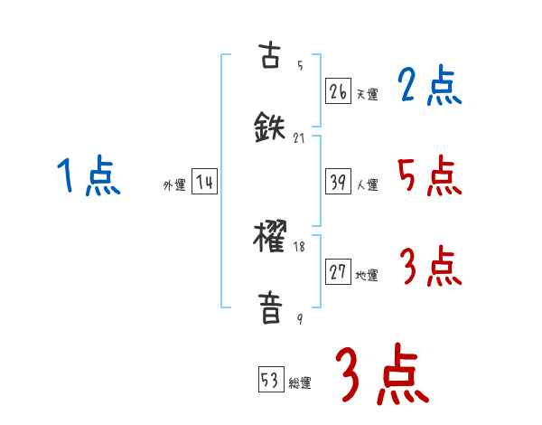 総運![]() | 古鉄櫂音さんの総運は53画の3つ星!やや見栄っ張りで虚栄心がある。散財に注意。 あなたの人生を表す1番重要な運勢です。生涯を通じて影響する総合運となり、主に50歳以降の晩年期に影響を及ぼします。 |