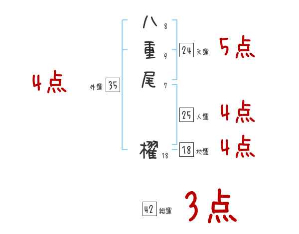 外運![]() | 八重尾櫂さんの外運は35画の4つ星!温厚な性格で感受性が高い。穏和な性格で人望が厚い。 生活面を象徴する運勢です。外部から受ける影響力を表し、結婚運、家庭運や職場、環境への順応性を表します。 |