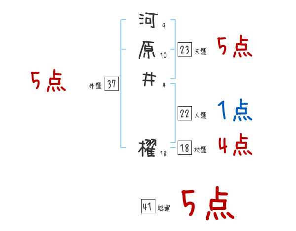 天運![]() | 河原井櫂さんの天運は23画の5つ星!想像力に優れ活力がある。一代で成功し名誉を手に入れる。 家系が持つ宿命的な運勢を表します。祖先から受け継いだ苗字ですので自分の力が及びません。家柄を象徴します。 |