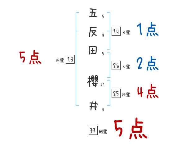 総運![]() | 五反田櫻井さんの総運は39画の5つ星!社交性に優れ人望が厚い。人の上に立ち成功する。 あなたの人生を表す1番重要な運勢です。生涯を通じて影響する総合運となり、主に50歳以降の晩年期に影響を及ぼします。 |
