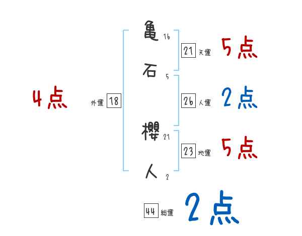 天運![]() | 亀石櫻人さんの天運は21画の5つ星!統率力がある。独立し成功する。名誉を手に入れる。 家系が持つ宿命的な運勢を表します。祖先から受け継いだ苗字ですので自分の力が及びません。家柄を象徴します。 |