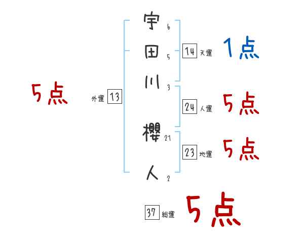 天運![]() | 宇田川櫻人さんの天運は14画の1つ星!人に対して優しいがストレスを溜め込みがち。人間関係のトラブルを避けるよう気をつけましょう。 家系が持つ宿命的な運勢を表します。祖先から受け継いだ苗字ですので自分の力が及びません。家柄を象徴します。 |