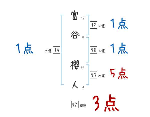 人運![]() | 富谷櫻人さんの人運は28画の1つ星!家庭環境に注意。スポーツで活躍できる能力があるかも。 性格や才能などを表す2番目に重要な運勢です。人間関係や協調性、社会的な成功に影響します。主に20歳から50歳ぐらいまでの中年期の運勢を表します。 |