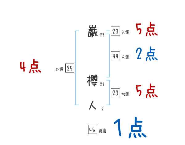 天運![]() | 巌櫻人さんの天運は23画の5つ星!想像力に優れ活力がある。一代で成功し名誉を手に入れる。 家系が持つ宿命的な運勢を表します。祖先から受け継いだ苗字ですので自分の力が及びません。家柄を象徴します。 |