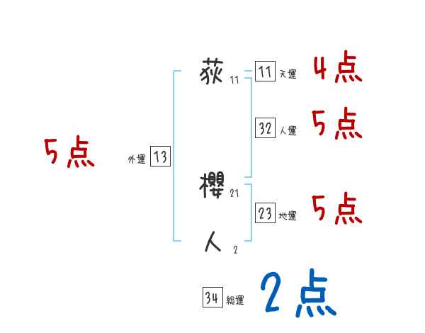 人運![]() | 荻櫻人さんの人運は32画の5つ星!柔軟性があり成功する。チャンスが多く金運が良い。 性格や才能などを表す2番目に重要な運勢です。人間関係や協調性、社会的な成功に影響します。主に20歳から50歳ぐらいまでの中年期の運勢を表します。 |