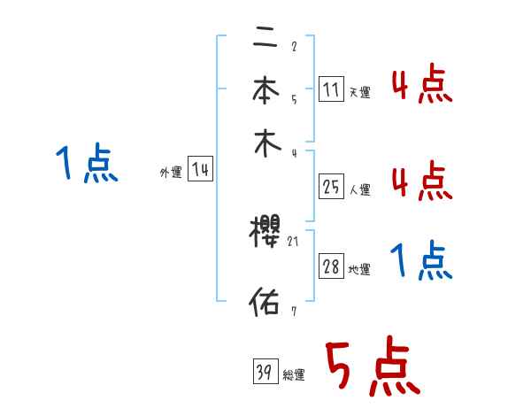 総運![]() | 二本木櫻佑さんの総運は39画の5つ星!社交性に優れ人望が厚い。人の上に立ち成功する。 あなたの人生を表す1番重要な運勢です。生涯を通じて影響する総合運となり、主に50歳以降の晩年期に影響を及ぼします。 |