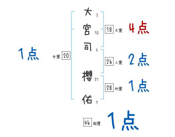 天運![]() | 大宮司櫻佑さんの天運は18画の4つ星!情熱的で剛気。忍耐力があり信頼される。 家系が持つ宿命的な運勢を表します。祖先から受け継いだ苗字ですので自分の力が及びません。家柄を象徴します。 |