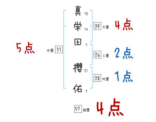 総運![]() | 真栄田櫻佑さんの総運は57画の4つ星!向上心があり人望がある。地位を得る。 あなたの人生を表す1番重要な運勢です。生涯を通じて影響する総合運となり、主に50歳以降の晩年期に影響を及ぼします。 |