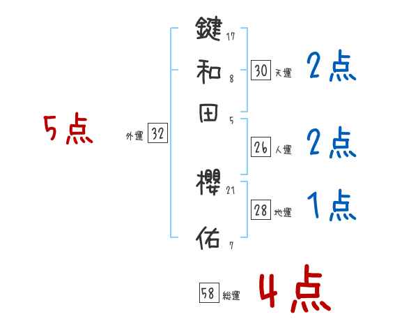 外運![]() | 鍵和田櫻佑さんの外運は32画の5つ星!柔軟性があり成功する。チャンスが多く金運が良い。 生活面を象徴する運勢です。外部から受ける影響力を表し、結婚運、家庭運や職場、環境への順応性を表します。 |