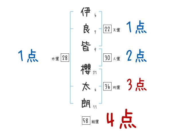 地運![]() | 伊良皆櫻太朗さんの地運は36画の3つ星!先見性が豊かです。多少神経質で苦労することも。 個性を表す基礎的な運勢です。性格形成や対人関係、行動力など家庭環境に影響されます。主に誕生してから20歳くらいまでの若年期の運勢を表します。 |