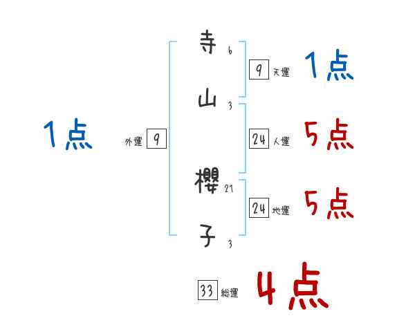 天運![]() | 寺山櫻子さんの天運は9画の1つ星!消極的で才能を発揮することが苦手なことも。周りの意見に耳を傾けましょう。 家系が持つ宿命的な運勢を表します。祖先から受け継いだ苗字ですので自分の力が及びません。家柄を象徴します。 |
