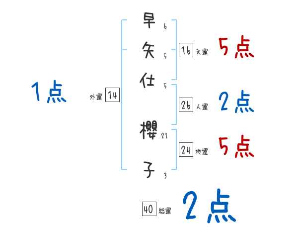 天運![]() | 早矢仕櫻子さんの天運は16画の5つ星!人望が厚く大きく発展する。逆転成功が見える。 家系が持つ宿命的な運勢を表します。祖先から受け継いだ苗字ですので自分の力が及びません。家柄を象徴します。 |