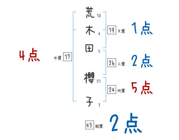 外運![]() | 荒木田櫻子さんの外運は17画の4つ星!積極的な行動力。地位を気づき財産を手に入れる。純粋な心と直感力。 生活面を象徴する運勢です。外部から受ける影響力を表し、結婚運、家庭運や職場、環境への順応性を表します。 |
