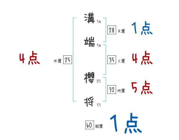 天運![]() | 溝端櫻将さんの天運は28画の1つ星!家庭環境に注意。スポーツで活躍できる能力があるかも。 家系が持つ宿命的な運勢を表します。祖先から受け継いだ苗字ですので自分の力が及びません。家柄を象徴します。 |
