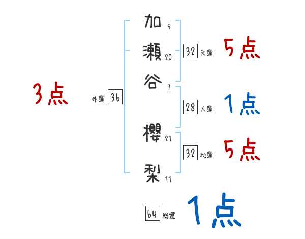 天運![]() | 加瀬谷櫻梨さんの天運は32画の5つ星!柔軟性があり成功する。チャンスが多く金運が良い。 家系が持つ宿命的な運勢を表します。祖先から受け継いだ苗字ですので自分の力が及びません。家柄を象徴します。 |
