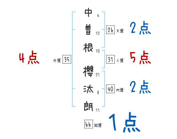 外運![]() | 中曽根櫻汰朗さんの外運は35画の4つ星!温厚な性格で感受性が高い。穏和な性格で人望が厚い。 生活面を象徴する運勢です。外部から受ける影響力を表し、結婚運、家庭運や職場、環境への順応性を表します。 |