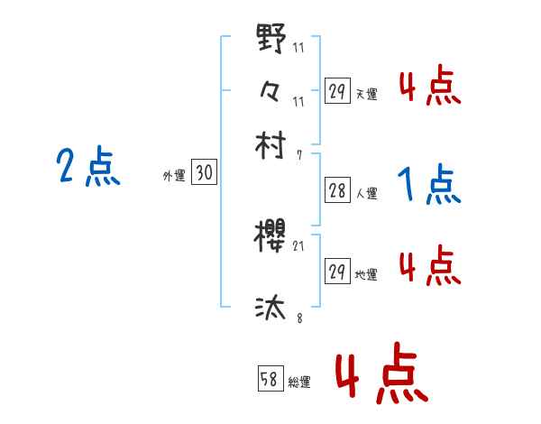 天運![]() | 野々村櫻汰さんの天運は29画の4つ星!完全主義で才能がある。厳格な心の持ち主。 家系が持つ宿命的な運勢を表します。祖先から受け継いだ苗字ですので自分の力が及びません。家柄を象徴します。 |