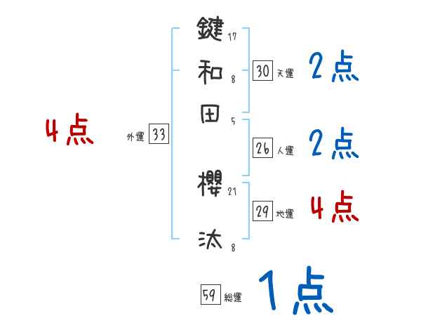 天運![]() | 鍵和田櫻汰さんの天運は30画の2つ星!浮き沈みの激しさに注意しましょう。 家系が持つ宿命的な運勢を表します。祖先から受け継いだ苗字ですので自分の力が及びません。家柄を象徴します。 |