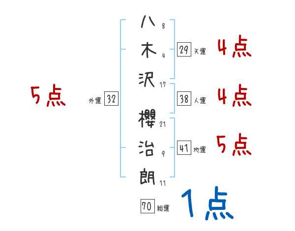 外運![]() | 八木沢櫻治朗さんの外運は32画の5つ星!柔軟性があり成功する。チャンスが多く金運が良い。 生活面を象徴する運勢です。外部から受ける影響力を表し、結婚運、家庭運や職場、環境への順応性を表します。 |
