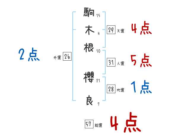 総運![]() | 駒木根櫻良さんの総運は57画の4つ星!向上心があり人望がある。地位を得る。 あなたの人生を表す1番重要な運勢です。生涯を通じて影響する総合運となり、主に50歳以降の晩年期に影響を及ぼします。 |