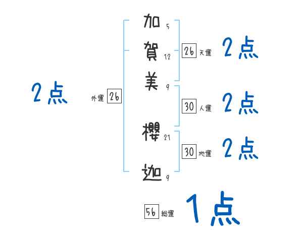 外運![]() | 加賀美櫻迦さんの外運は26画の2つ星!波瀾万丈かも。信頼できる人を大事にしましょう。 生活面を象徴する運勢です。外部から受ける影響力を表し、結婚運、家庭運や職場、環境への順応性を表します。 |