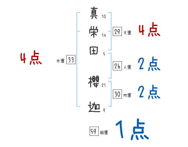 天運![]() | 真栄田櫻迦さんの天運は29画の4つ星!完全主義で才能がある。厳格な心の持ち主。 家系が持つ宿命的な運勢を表します。祖先から受け継いだ苗字ですので自分の力が及びません。家柄を象徴します。 |