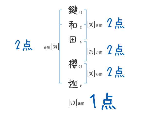 天運![]() | 鍵和田櫻迦さんの天運は30画の2つ星!浮き沈みの激しさに注意しましょう。 家系が持つ宿命的な運勢を表します。祖先から受け継いだ苗字ですので自分の力が及びません。家柄を象徴します。 |
