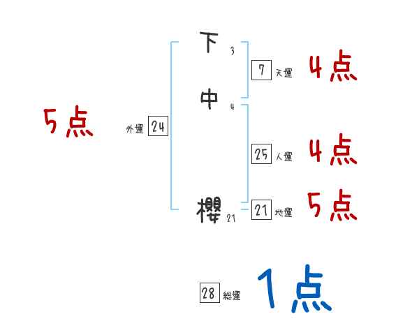 天運![]() | 下中櫻さんの天運は7画の4つ星!強い意志や信念を持ち独立心が強い。自立する。 家系が持つ宿命的な運勢を表します。祖先から受け継いだ苗字ですので自分の力が及びません。家柄を象徴します。 |