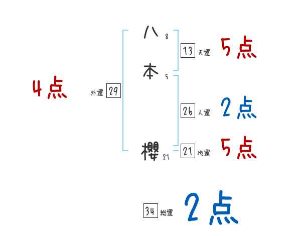 天運![]() | 八本櫻さんの天運は13画の5つ星!才能に恵まれ人気がある。名声を手に入れる。円満な人生。 家系が持つ宿命的な運勢を表します。祖先から受け継いだ苗字ですので自分の力が及びません。家柄を象徴します。 |