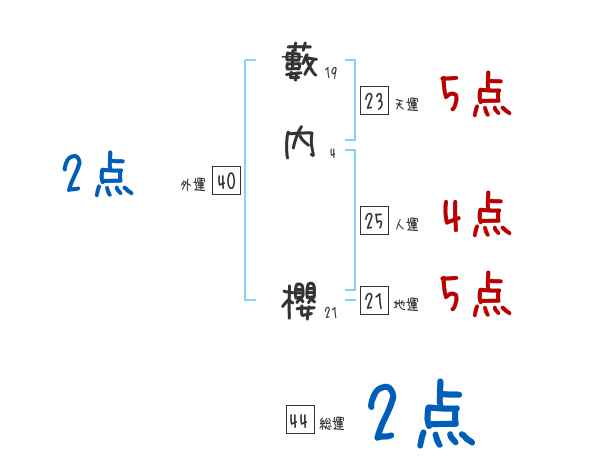 外運![]() | 藪内櫻さんの外運は40画の2つ星!自信過剰で物事に固執するためトラブルに注意。 生活面を象徴する運勢です。外部から受ける影響力を表し、結婚運、家庭運や職場、環境への順応性を表します。 |