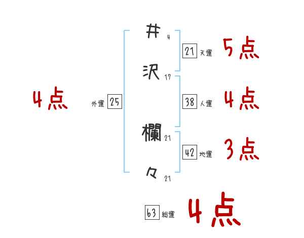 総運![]() | 井沢欄々さんの総運は63画の4つ星!家庭運がよく順調な生活。温和な性格。 あなたの人生を表す1番重要な運勢です。生涯を通じて影響する総合運となり、主に50歳以降の晩年期に影響を及ぼします。 |