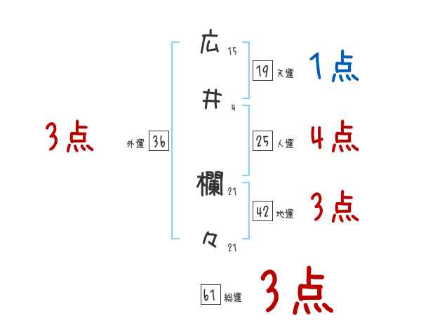 天運![]() | 広井欄々さんの天運は19画の1つ星!優れた才能を持ちますが、協調性が足りないことも。周りの人と協力する事を意識しましょう。 家系が持つ宿命的な運勢を表します。祖先から受け継いだ苗字ですので自分の力が及びません。家柄を象徴します。 |