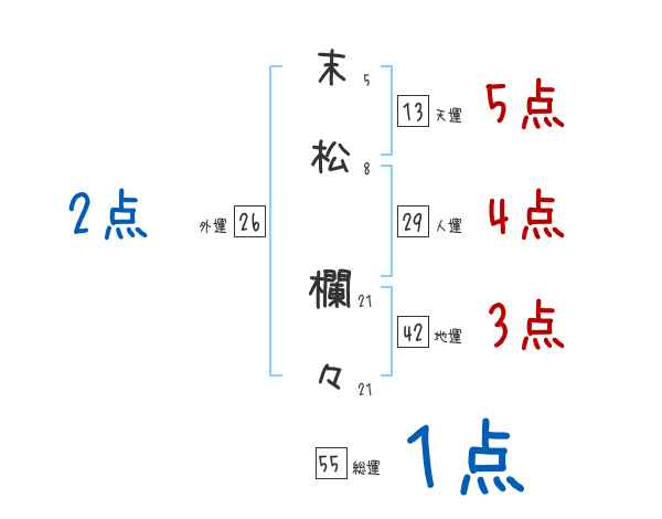 天運![]() | 末松欄々さんの天運は13画の5つ星!才能に恵まれ人気がある。名声を手に入れる。円満な人生。 家系が持つ宿命的な運勢を表します。祖先から受け継いだ苗字ですので自分の力が及びません。家柄を象徴します。 |
