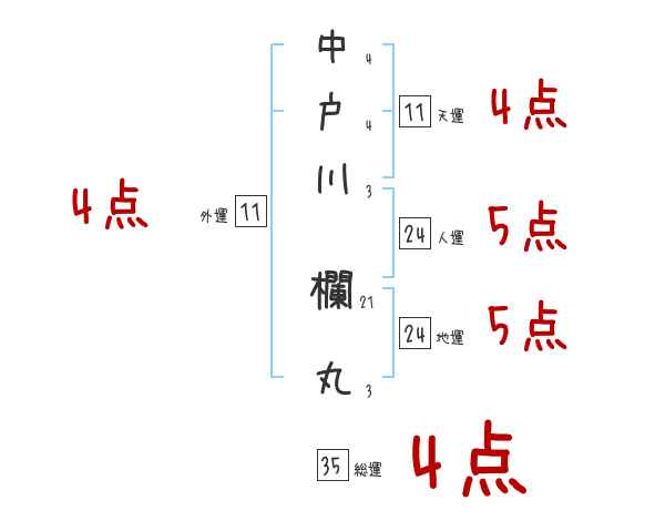天運![]() | 中戸川欄丸さんの天運は11画の4つ星!着実に富や地位を得る幸運な人生。 家系が持つ宿命的な運勢を表します。祖先から受け継いだ苗字ですので自分の力が及びません。家柄を象徴します。 |