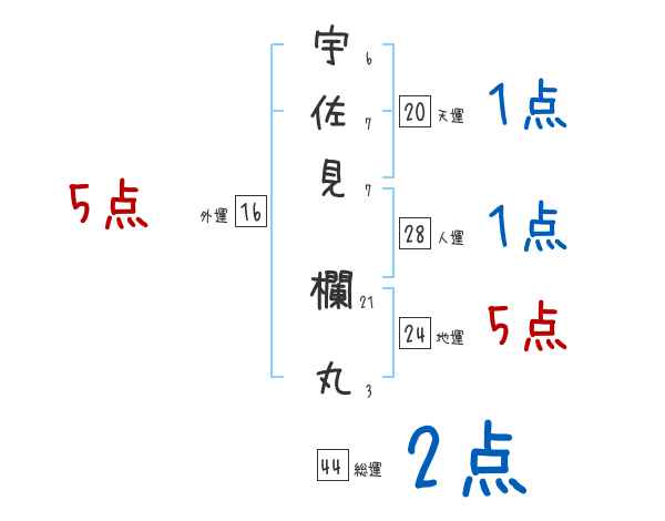 人運![]() | 宇佐見欄丸さんの人運は28画の1つ星!家庭環境に注意。スポーツで活躍できる能力があるかも。 性格や才能などを表す2番目に重要な運勢です。人間関係や協調性、社会的な成功に影響します。主に20歳から50歳ぐらいまでの中年期の運勢を表します。 |