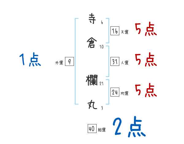 天運![]() | 寺倉欄丸さんの天運は16画の5つ星!人望が厚く大きく発展する。逆転成功が見える。 家系が持つ宿命的な運勢を表します。祖先から受け継いだ苗字ですので自分の力が及びません。家柄を象徴します。 |